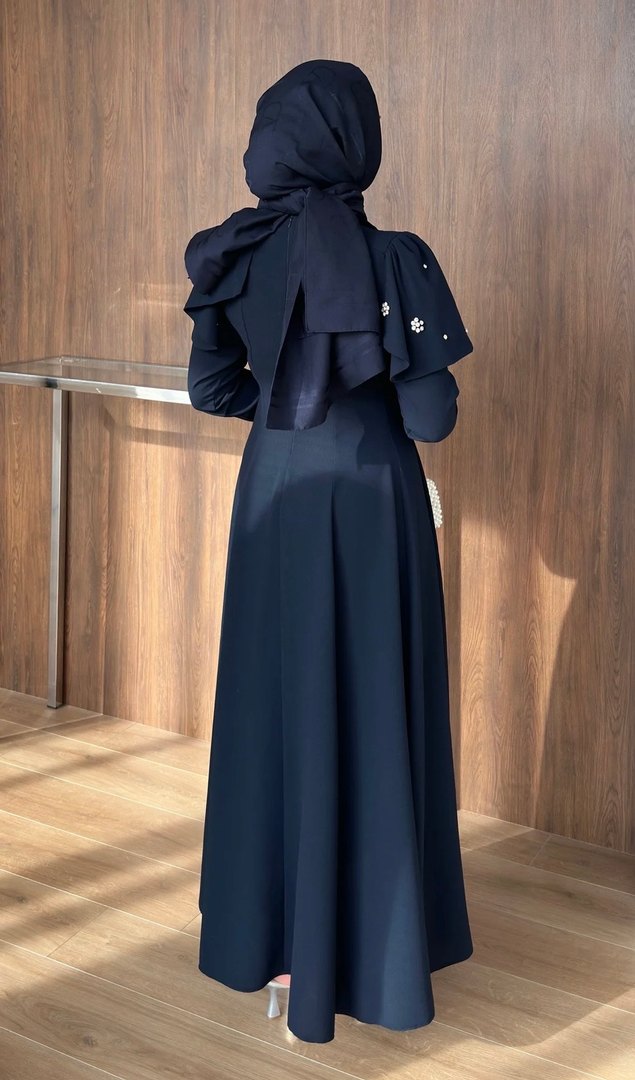 Siyah uzun kollu bu gece elbisesi, drapeli ve yakalı detaylarıyla ofise uygun, modest ve regular fit gotik tarz sunar.