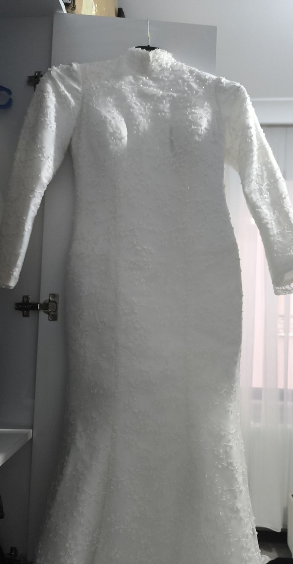 KİRALIK GELİNLİK NİKAHLIK Uzun kollu, yüksek yakalı beyaz balık gelinlik, ince dokulu kumaştan sade ve klasik bir görünüm sunar.