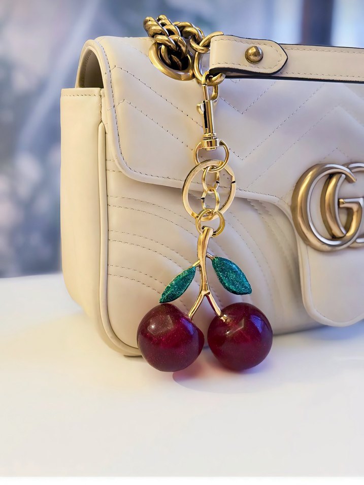 Parlak beyaz, zincir detaylı ve iki kiraz figürlü anahtarlık, Paris sokak modasına klasik bir dokunuş katıyor.