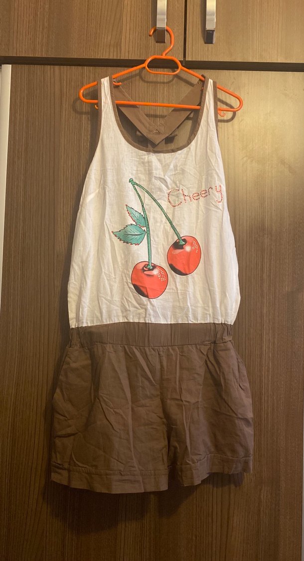 Kiraz baskılı, taşlı kahverengi şort tulum. Ön kısmında 'Cheery' yazısı ve rahat kesimi ile kolsuz tasarım sunar. Arkası ve beli lastikli. Kurdele detaylı, hiç giyilmedi