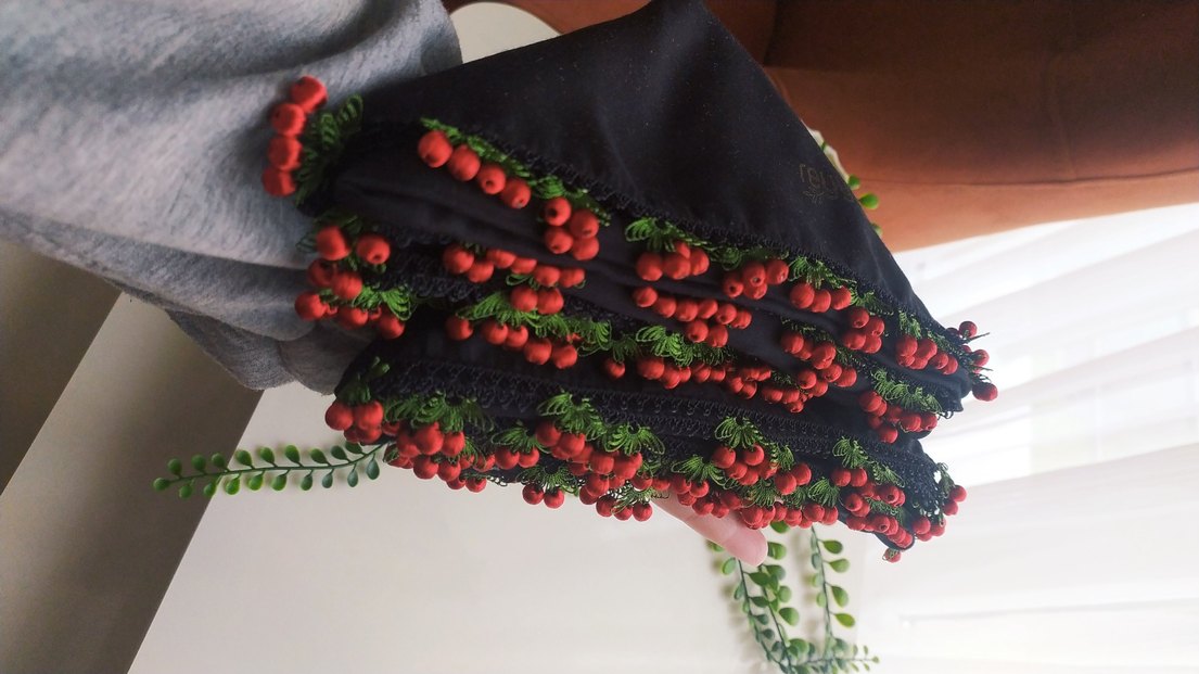 Koyu kırmızı tekstil kumaştan, boncuk işlemeli, geleneksel tarzda kadın şalı. Bohem ve retro bir hava katıyor. sipariş aliyorum fiyat sorunuz
