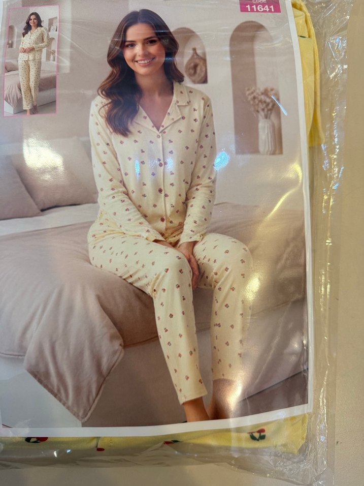 Rahat kesim, uzun kollu, pastel sarı renkli kiraz desen baskılı kadın pijama takımı. Konforlu ve rahat kullanım sağlar. Bedenleri vardır #trendpijama #colournights #penti #suwen #lcw #lcwdreams #koton #defacto #dagi #m&s #h&m