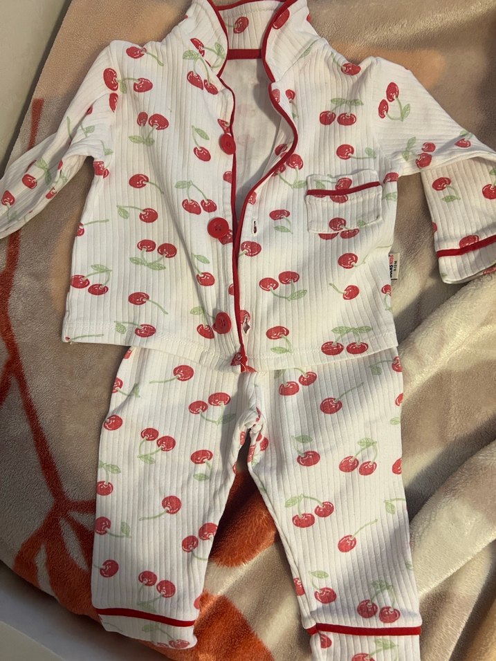 Kiraz desenli, beyaz renkli, uzun kollu ve yakalı bebek pijama takımı. Rahat ve yumuşak kumaştan üretilmiştir.