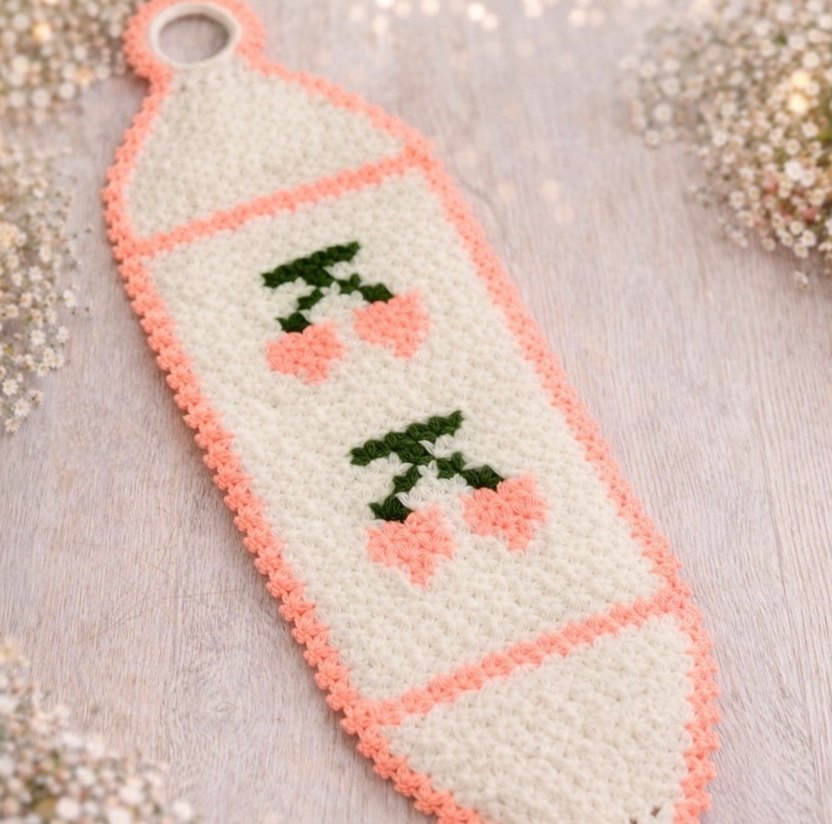 Askılı kiraz desenli beyaz banyo süngeri, yumuşak dokusuyla nazik temizlik sağlar.