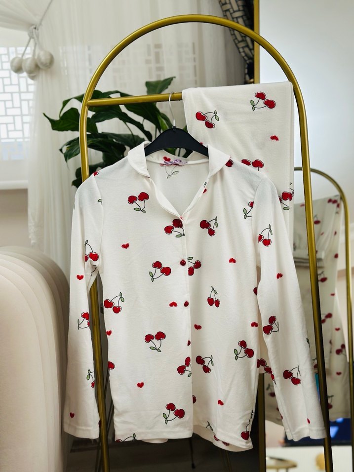 Uzun kollu ve kiraz desenli beyaz kadın pijama takımı, midi boy pantolonuyla rahat ve günlük tarzda tasarlanmıştır.