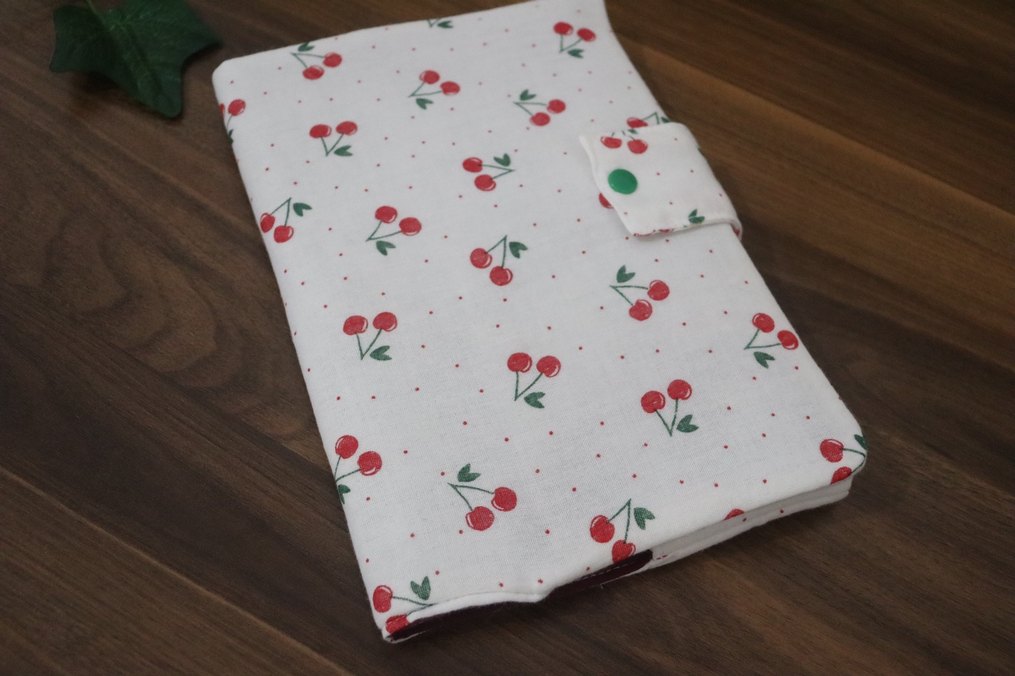 Beyaz kumaş kapak üzerinde renkli kiraz desenleri ve çıtçıtlı kapama bulunan kitap kılıfı. Ölçüye göre fiyat değişmektedir