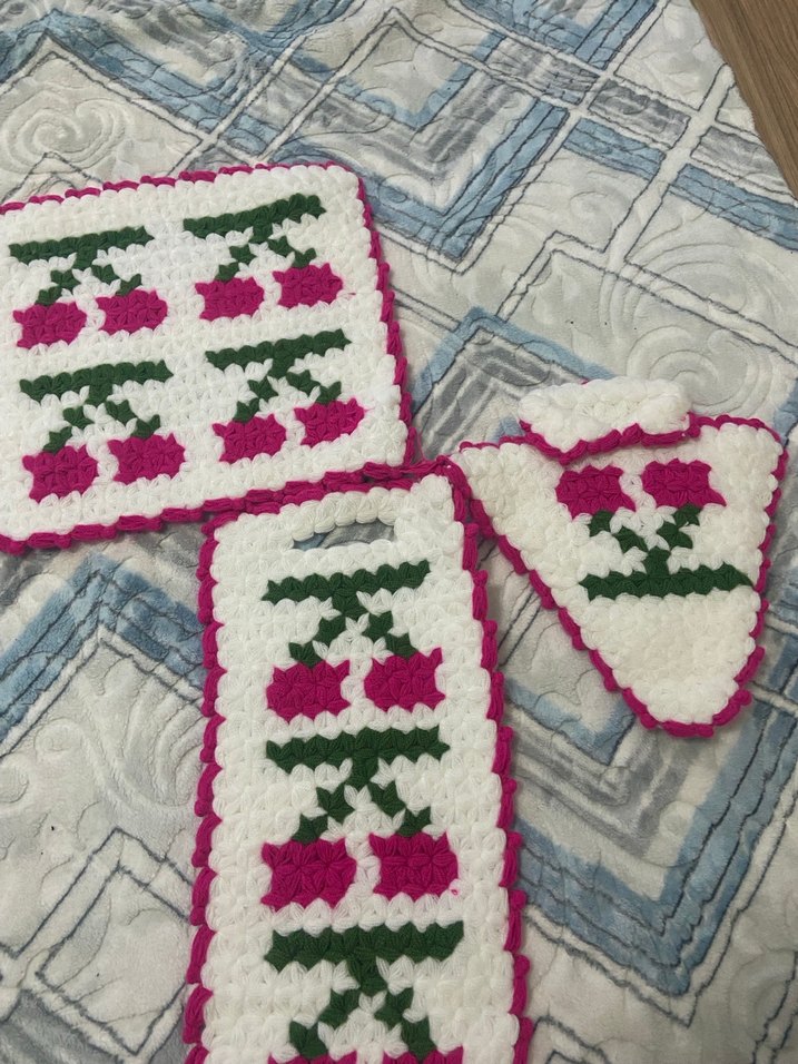 Kiraz desenli, beyaz, pembe ve yeşil iplikten el örgüsü parçalar içeren set. Kabartmalı desen ve süslü kenarlara sahiptir.