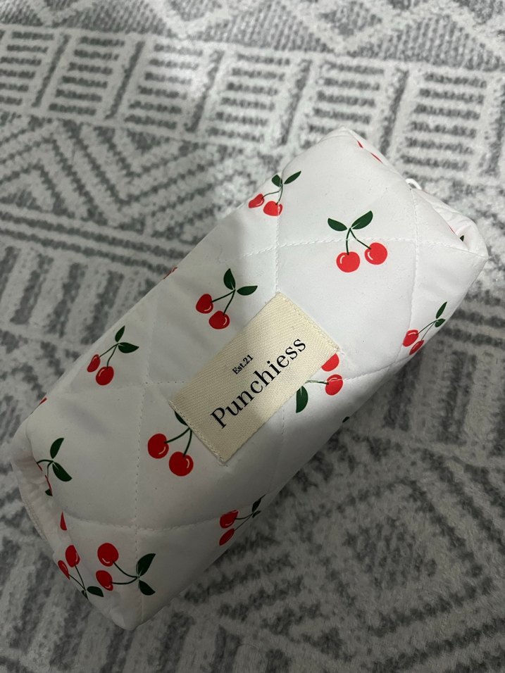 Beyaz renkte, kiraz desenli, plise detaylı sentetik kumaştan kadın makyaj çantası. Punchiess markalı, günlük kullanıma uygun, rahat ve pastel tarza sahip.