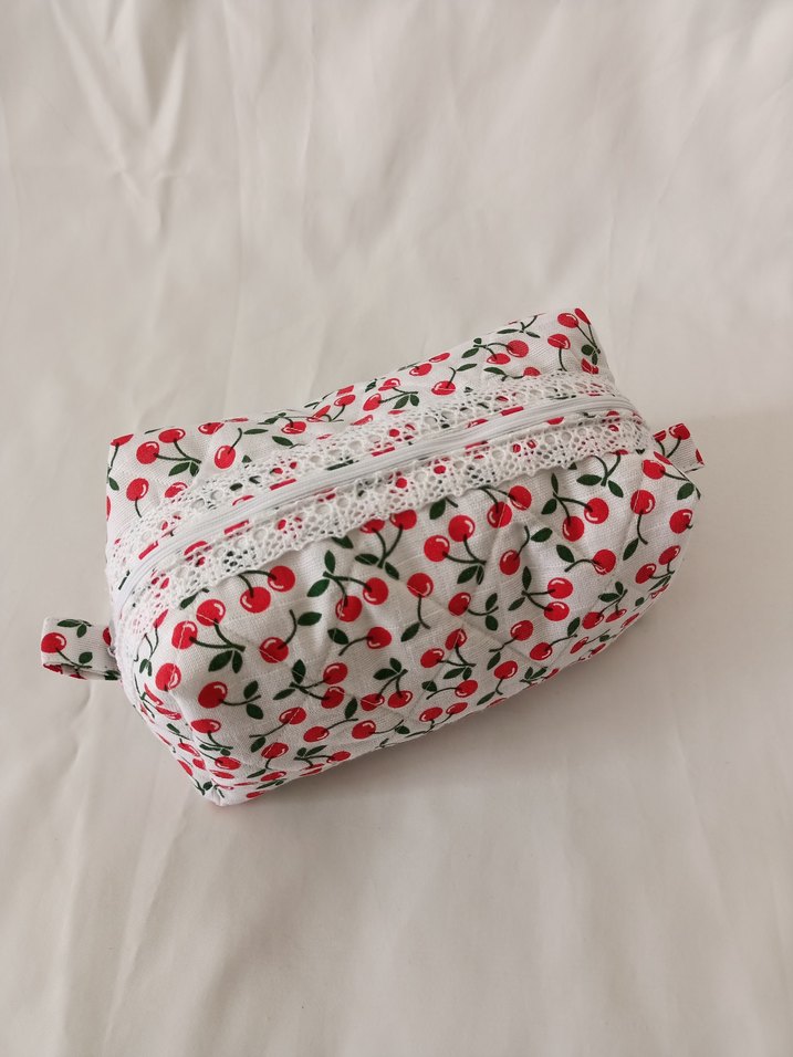 Kapitoneli,kiraz desenli ve dantelli, makyaj çantası, günlük kullanım için uygun