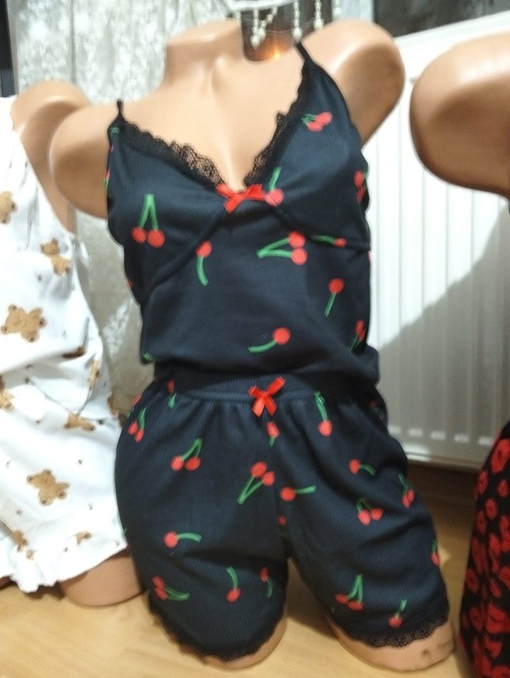 Kiraz desenli siyah, ip askılı üst ve dantelli şortlardan oluşan, rahat ve sokak stili uyumlu mini pijama takımı.