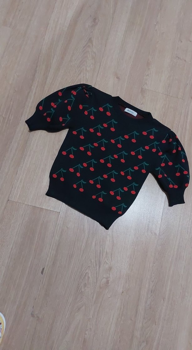 Kiraz desenli siyah triko kazak, kısa kollu ve yuvarlak yakalıdır. Rahat ve bol kesimli, günlük şıklık için uygundur.