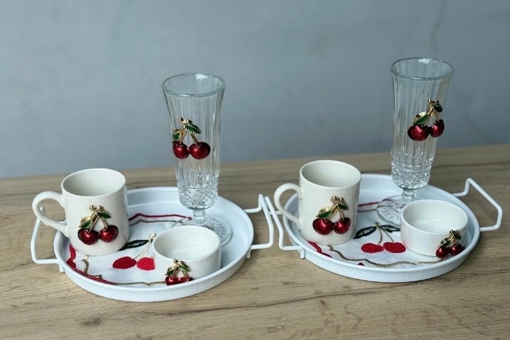 Kiraz Detaylı Beyaz Bardak ve Fincan Seti