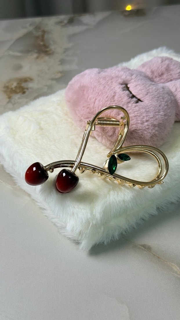 Altın tonlu, kiraz şeklinde kırmızı boncuk ve yeşil yaprak detaylı, tüylü ve rahat tasarımlı kadın saç tokası.