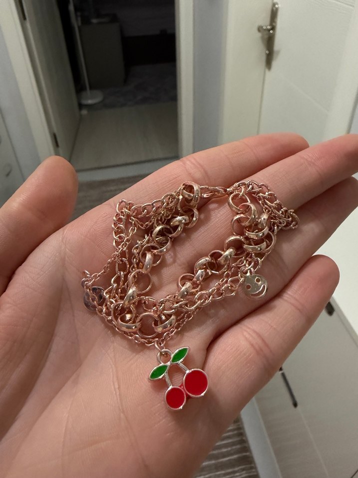 Kiraz ve gülen yüz detaylı üçlü zincirli bileklik rose gold gibi bir rengi var kararma yapar mı bilmiyorum hiç kullanılmadı çelik olmayabilir bana hediye gelmişti