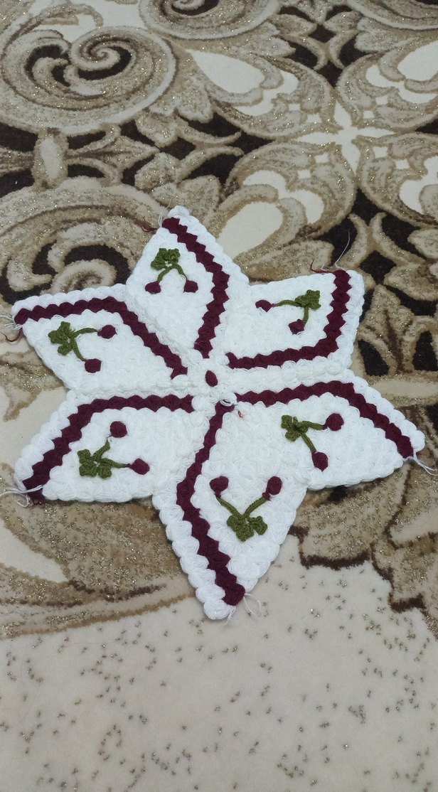 Kiraz işlemeli, beyaz tabanlı, kırmızı ve yeşil detaylara sahip el yapımı örgü supla