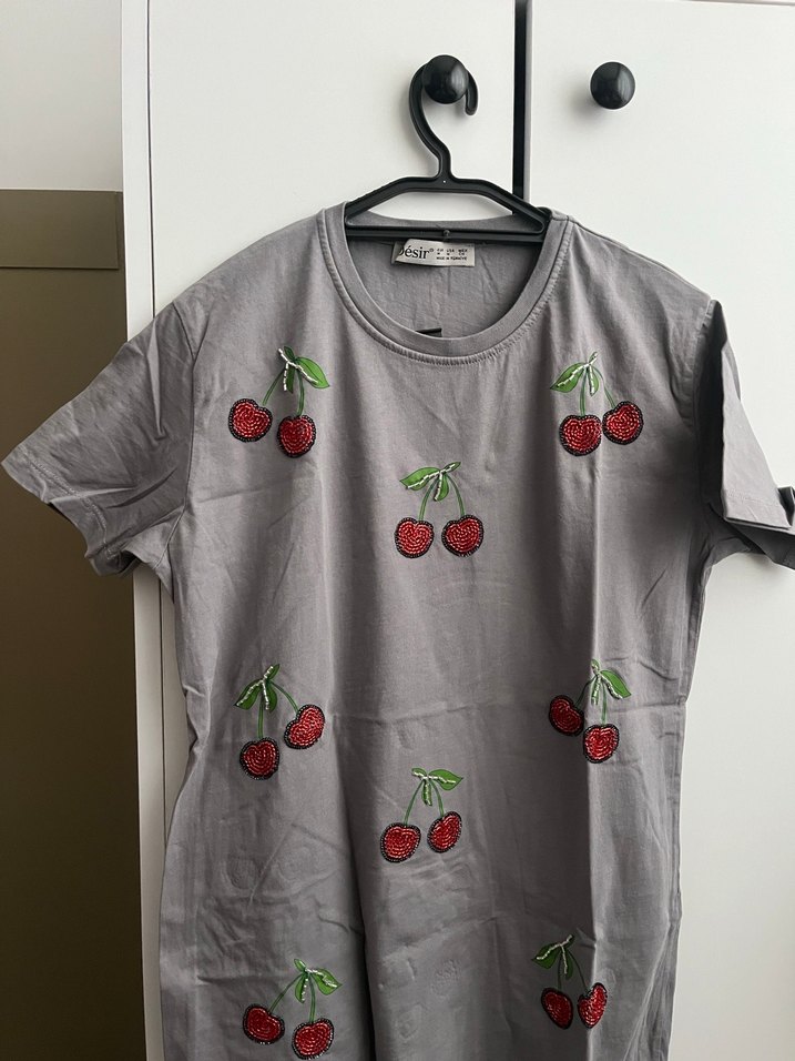 Gri renkli, kısa kesim kadın tişörtü; yuvarlak yaka ve kısa kollu, rahat kesimdir. Nakışlı kiraz detayları bulunur, pamuklu kumaştan üretilmiştir. Ürünü bir defa bir saatliğine giydim ben genel olarak L beden kullanıyorum bu ürün M beden olduğu için bana tam oldu ama ben çok rahat edemedim M beden birine daha çok uygun olur.  Pamuklu güzel terletmeyen bir kumaş üzerindeki Kirazlar da boncuk detaylıdır.