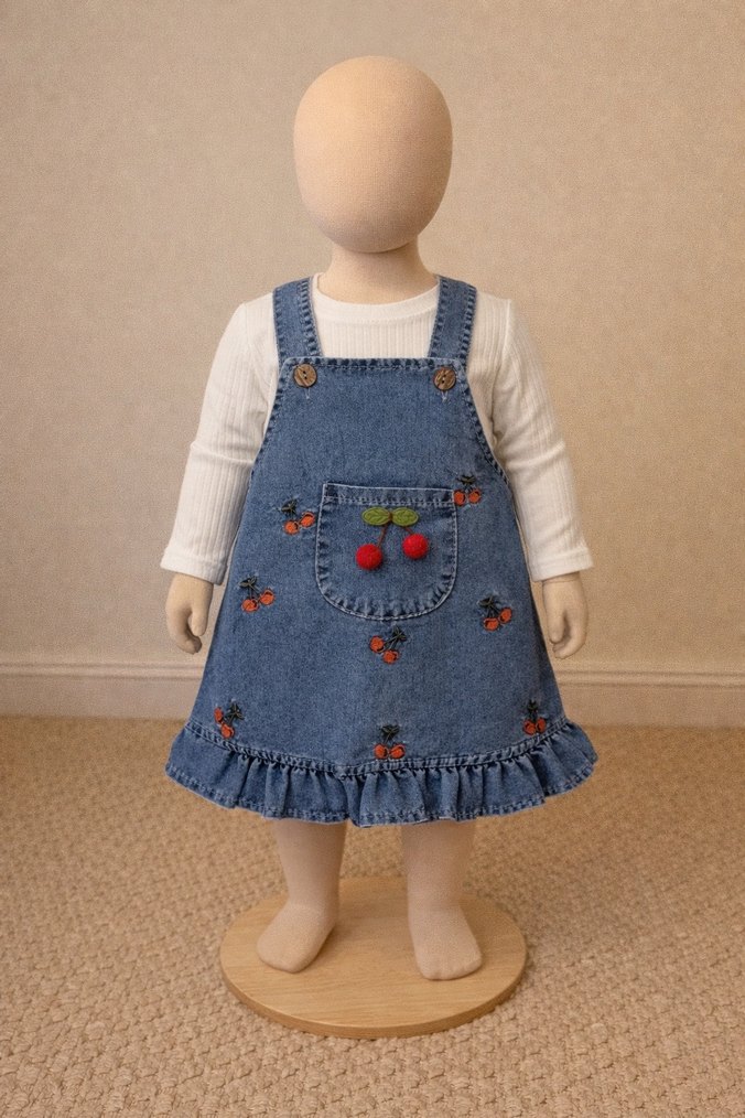 Şirin kiraz nakış detaylarıyla tasarlanan kot elbise, yumuşak dokulu beyaz body ile birlikte kombin halinde sunulmaktadır. Günlük kullanım için rahat, şık ve kullanışlıdır. Beden aralığı: 9 aydan 18 aya kadar beden mevcuttur Kumaş: Kot elbise & pamuklu body