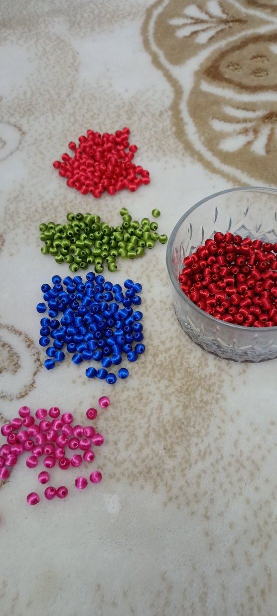Kırmızı, yeşil, mavi ve pembe renklerde küçük boncuklar içeren bohem tarzı el işi seti. KİRAZ OYASI BONCUK SAYFAMDA RENKLER VAR. PAKET ADETİ 100 TANE.