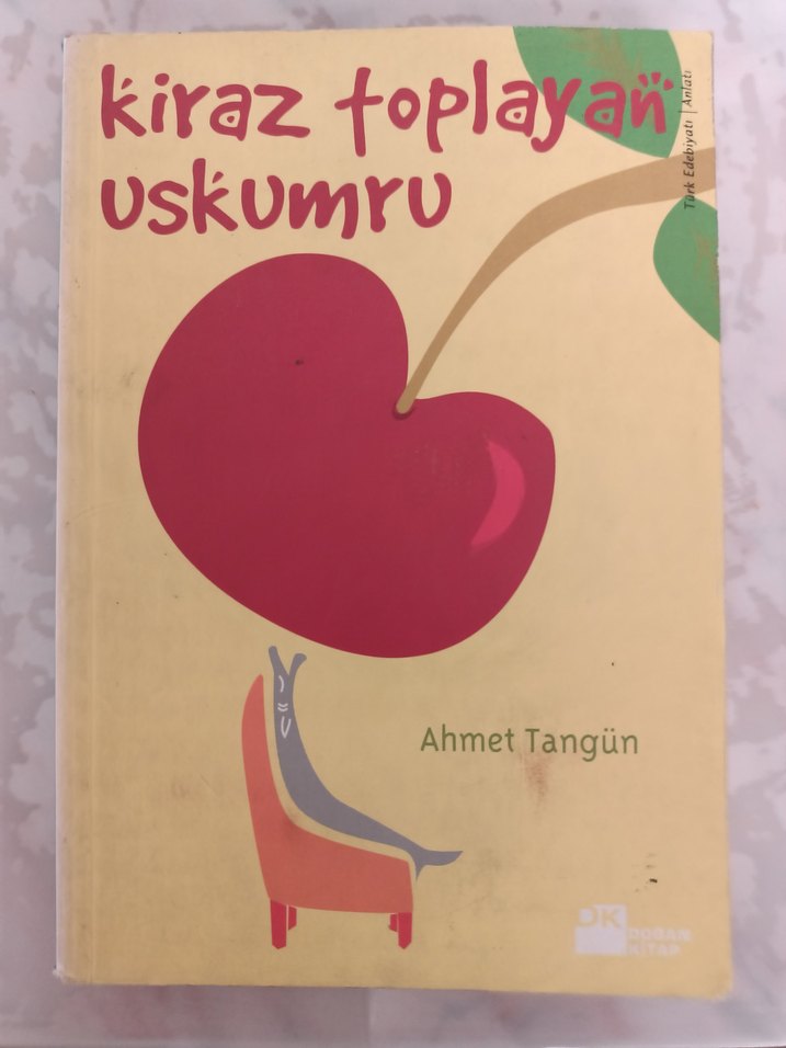 Ahmet Tangün'ün Kiraz Toplayan Uskumru kitabı, kapağında kiraz ve sandalyede oturan bir balık illüstrasyonu içerir.