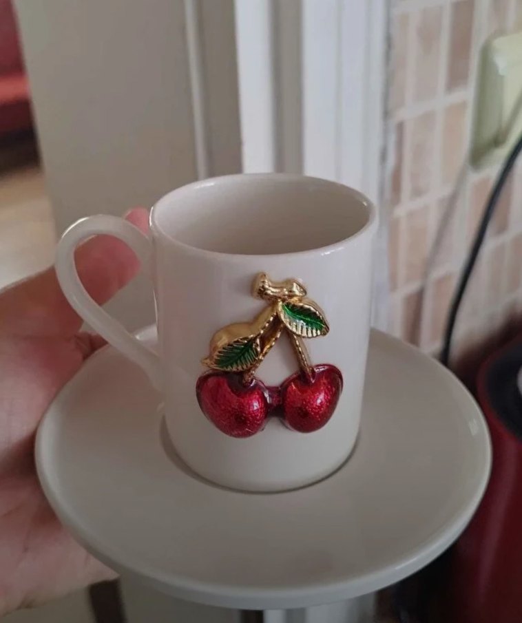 Kiraz figürlü parlak detaylı beyaz seramik fincan ve tabağı, espresso için uygundur. 6 lı