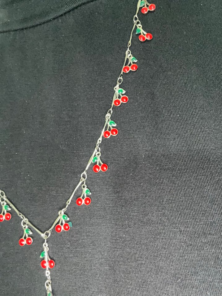 küçük kırmızı kiraz motiflerine sahip bohem tarzda detaylı zincir kolye. Midi uzunlukta, günlük kullanıma uygun, renkli ve retro bir dokunuş sağlar.
