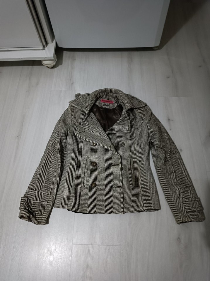 Kahverengi renkte, düğmeli ve kısa yaka detaylı kadın ceket. Uzun kollu, midi boyda ve regular fit kesim. Sentetik kumaştan, günlük sokak stili için uygun.
