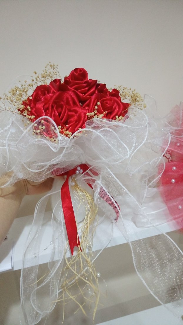 Canlı kırmızı kurdele güllerle çevrili, yumuşak beyaz kumaş ve narin cipsolarla süslenmiş geleneksel düğün aksesuarı.