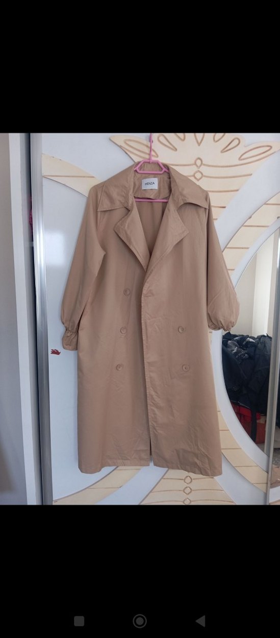kırem renkli, uzun boylu, düğmeli trençkot. Notch yaka ve uzun kollu, bir düğmesi yok