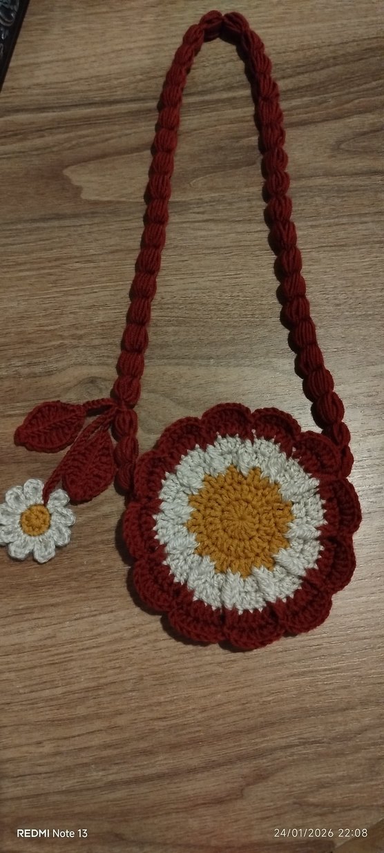 kiremit , beyaz ve sarı renklerde örgü çiçek desenli bohem tarzda çanta. Ana bölümü çiçek şeklinde ve askısında papatya detayı bulunur.