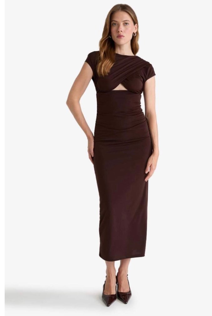 Drapeli tasarımı, V yaka ve askılı kollara sahip kahverengi uzun, vücuda oturan elbise. Pürüzsüz sentetik kumaştan üretilmiştir. Romantik akşamlar için uygun.