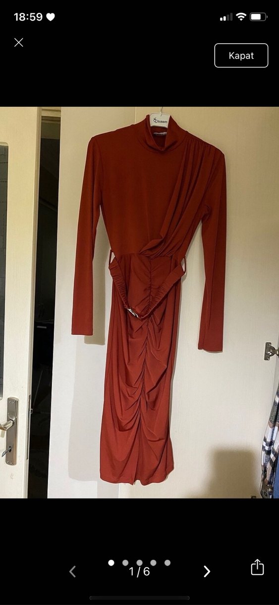Elbiseyi sadece bir defa nişanda giydim 36 beden kiremit rengi çok şık bir elbise ben ara boy olduğu için bir tık kestirdim midi boy olarak kullandım omuzdan itibaren 108 cm vücudu saran kemer detaylı ön kısmında küçük yırtmaçlı bir elbise 50 kg ile giydim boyum 1.65