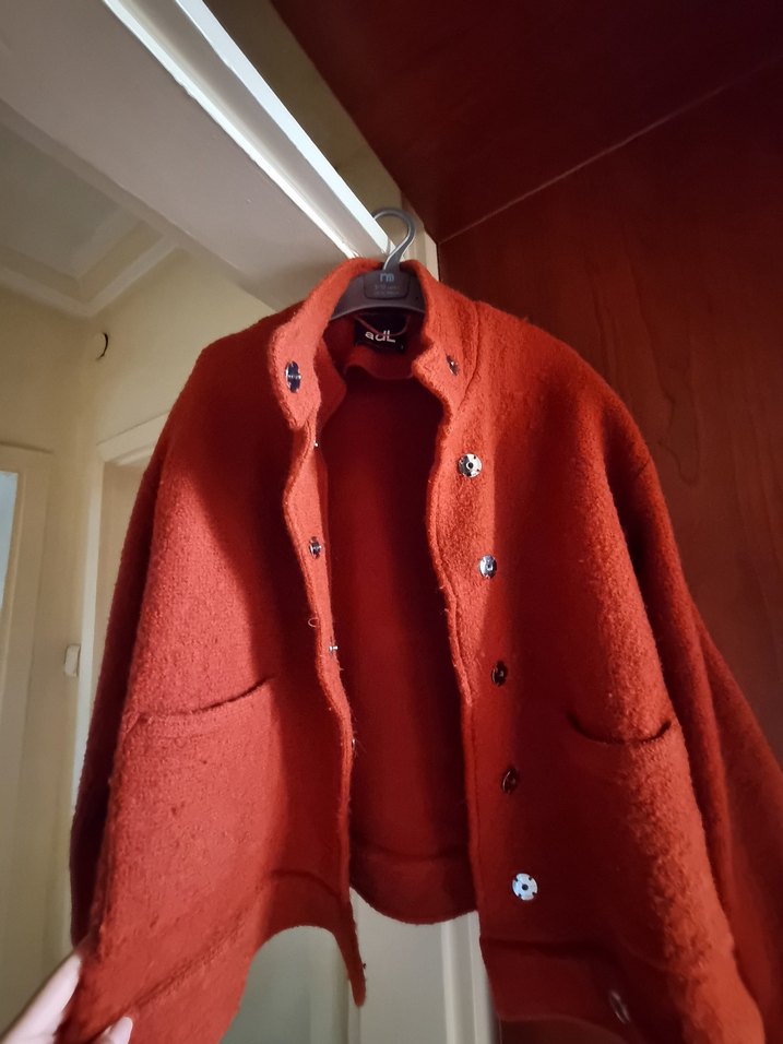 Kiremit renkte, düğmeli ve normal uzunlukta kadın kaşe kaban. Rahat kesimli, uzun kollu ve yumuşak, sıcak kumaştan üretilmiştir. Desensiz ve sokak stiline uygun. Sıcak tutar.