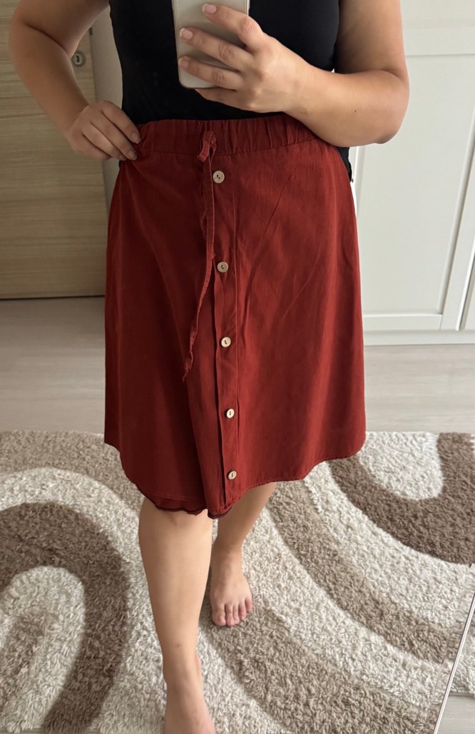 Bordo renkli, düğmeli midi boy keten etek, bol kesimi ve rahat bohem tarzıyla günlük kullanıma uygundur. Hasarsızdır. Solma yoktur