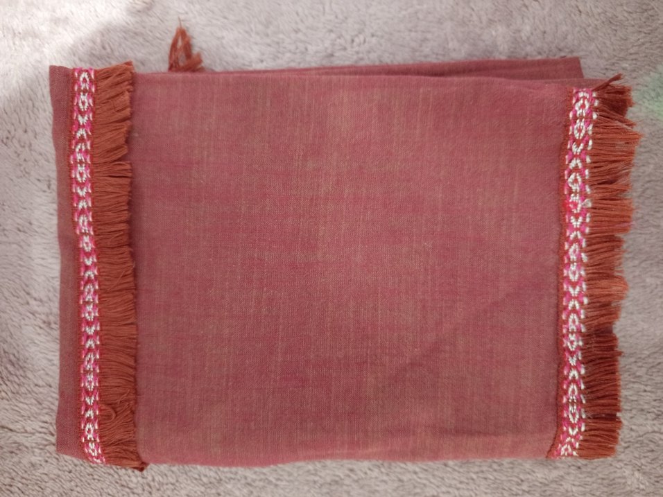 Yumuşak dokulu, şık detaylı şal. Temiz ve sorunsuzdur. Rengi kiremit-gül kurusu tonundadır. Günlük ve kombinlik kullanıma uygundur.