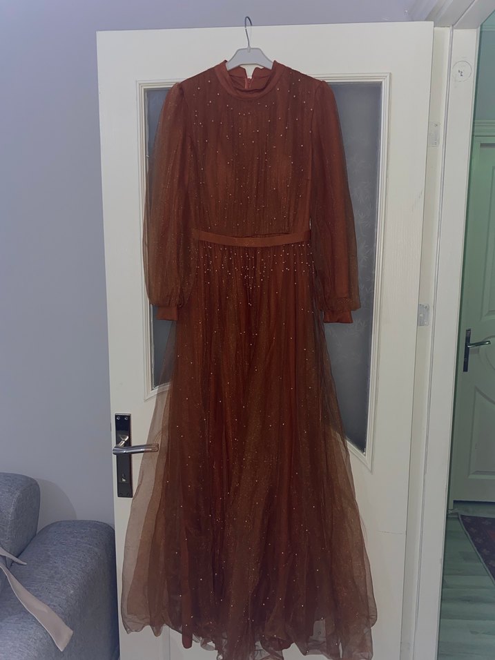 Uzun kahverengi elbise, bol kesim ve drapeli detaylara sahip. Parlak, desensiz kumaş ve yuvarlak yakalı, vintage bohem tarzını yansıtıyor. ✨ 2 kez kullanıldı