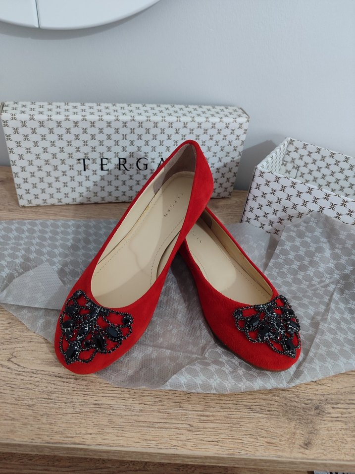 Kiremit babet, ön kısmında siyah boncuk işlemeli detaylarla. Kauçuk tabanlı, Tergan markalı klasik ve modern tarz kaliteli düğünler için uygun.
