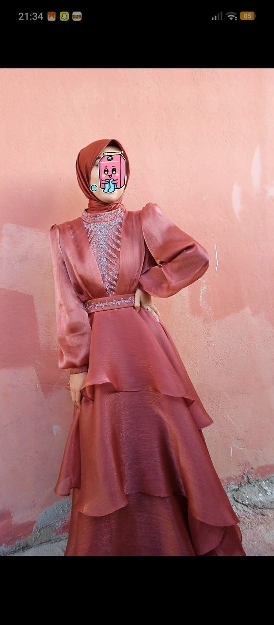 (eşarbı dahil)Bu kiremit, parlak ve işlemeli uzun kat kat abiye elbise, yüksek yakalı, drapeli ve uzun kolludur. Düğünler için klasik ve şık bir tercihtir.