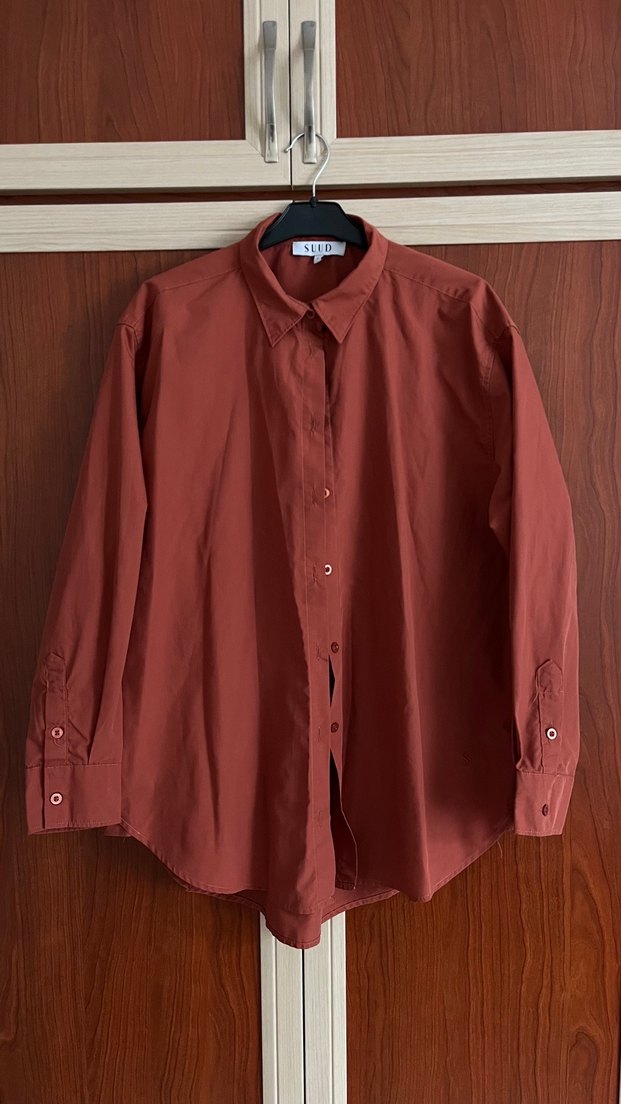 Kiremit renkli, düğmeli, uzun kollu ve yakalı kadın gömleği. Gevşek kesim ve ipeksi dokusuyla günlük kullanıma uygundur.