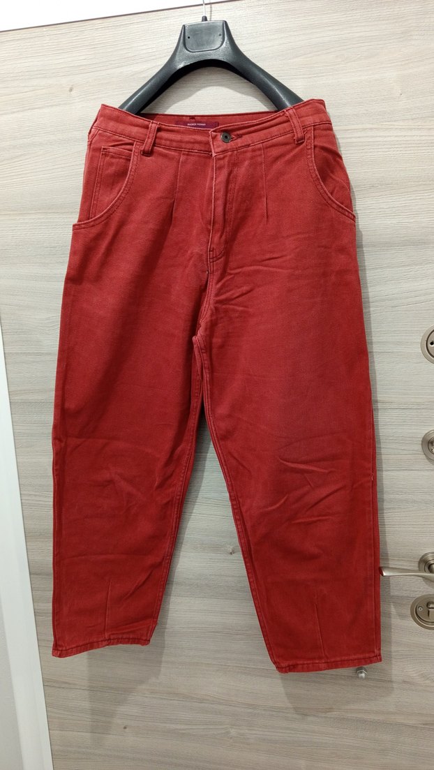 Kiremit renkte, keten kumaştan yapılmış, salaş kesim midi uzunlukta kadın pantolonu. Günlük kullanıma uygun rahat ve şık bir model.