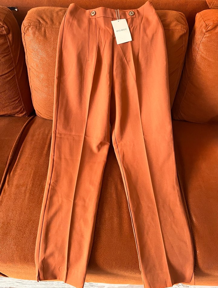Açık kiremit renkli, kumaştan yapılmış kadın midi pantolon, normal kesim ve parlak yüzey özelliğiyle minimal ve desen içermeyen tasarıma sahiptir. Günlük rahat kullanıma uygundur.