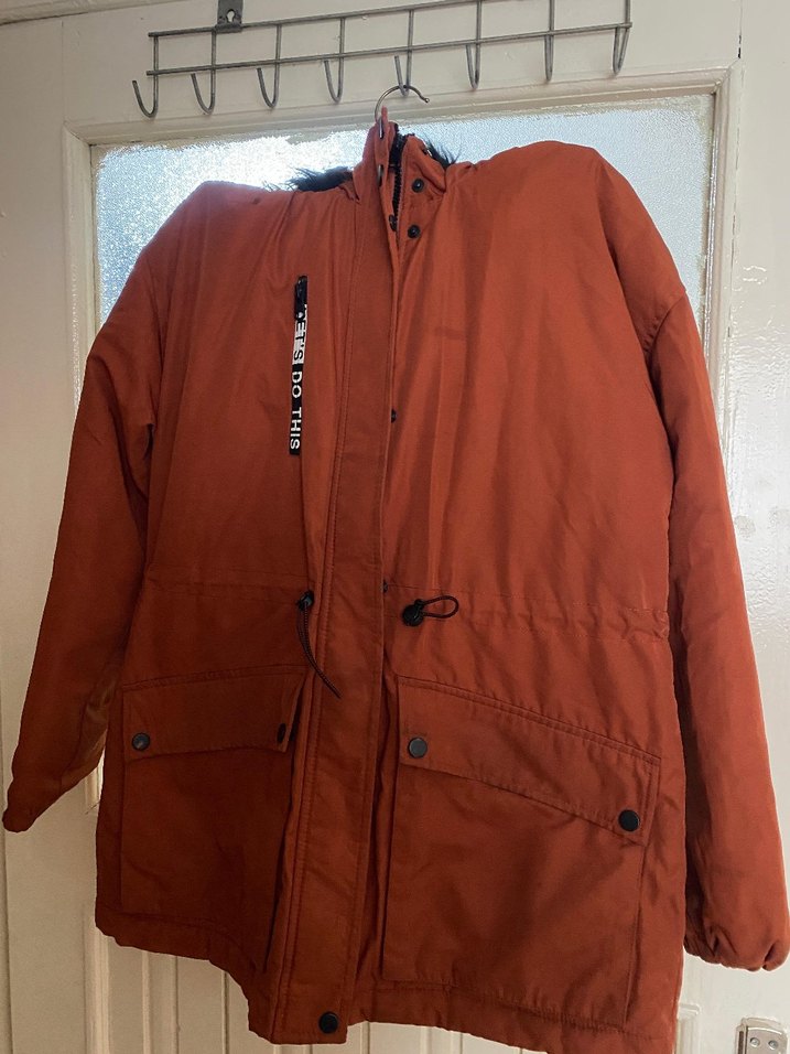 Kiremit uzun kadın ceket, bol kesim, kürk detaylı ve kesimli yaka ile. Uzun kollu, parlak yüzeyli, yumuşak ve sıcak kumaştan. Rahat sokak stili için uygun.