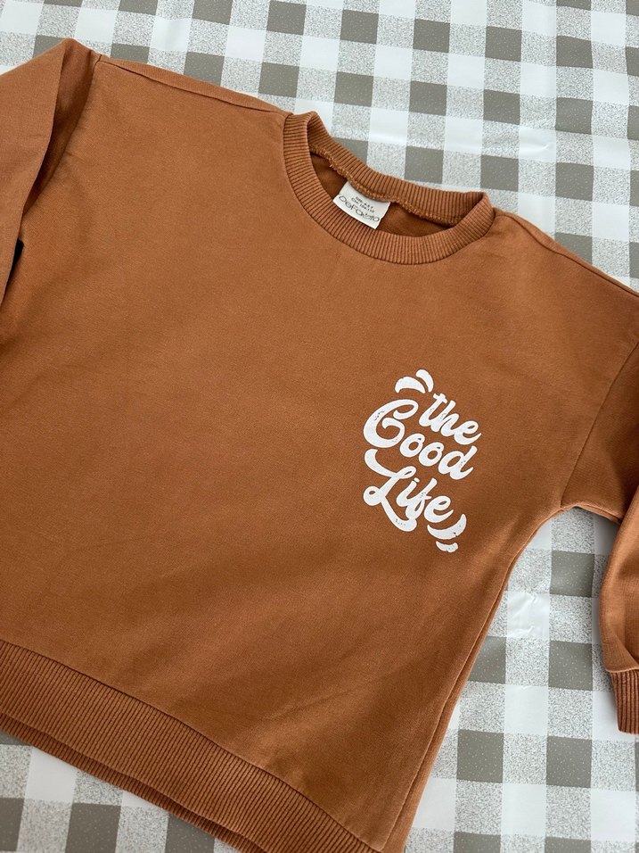 Kiremit kahve renk erkek çocuk sweatshirt, bol kesim ve uzun kollu. Pamuk örme kumaştan, "the Good Life" baskılı. Trendy günlük sokak stili için uygun.