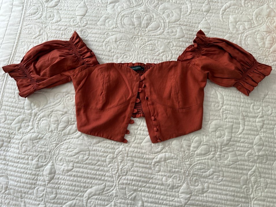 Kiremit keten kumaştan, düğmeli ve kısa kollu, bohem tarzda vintage görünümlü, vücuda oturan crop bluz.