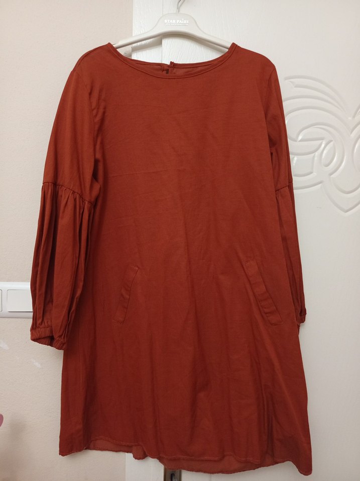 Keten kumaştan, uzun kollu ve midi boyda, yuvarlak yakalı kiremit tunik. Salaş kesimi ve drapeli detaylarıyla minimalist, bohem tarzda günlük kullanıma uygun.