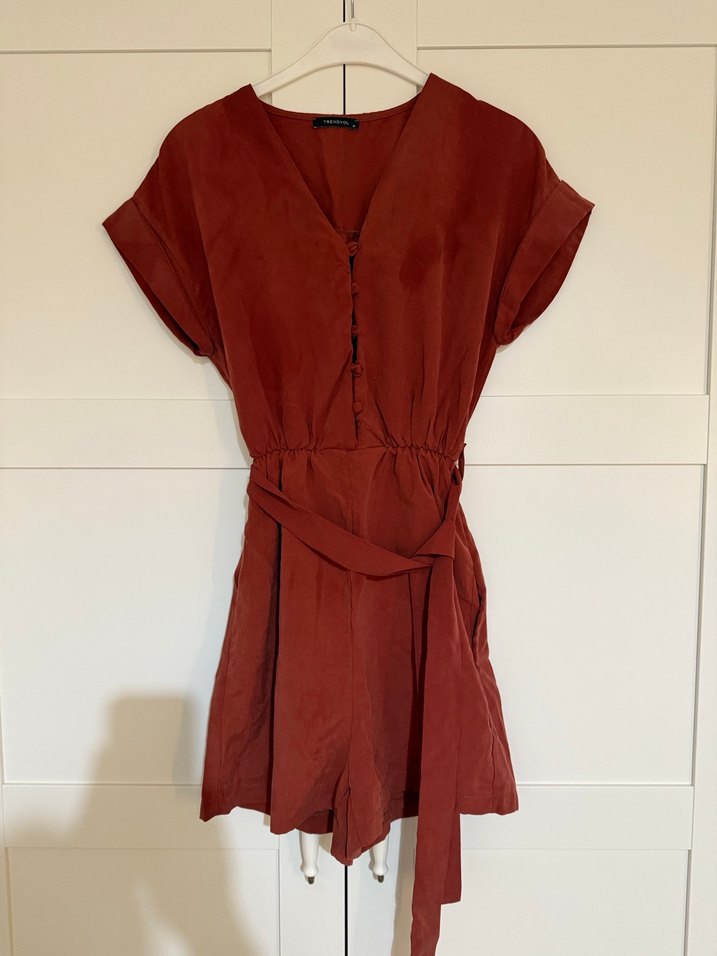 Kiremit rengi kısa tulum, bol kesim, kısa kollu ve V yaka. Kemer detaylı, minimalist ve bohem tarzda, günlük kullanıma uygun. Ütü su izidir üstündeki