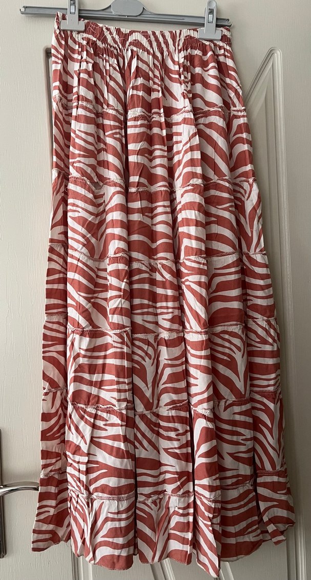 Kırmızı gri zebra desenli, pilili uzun etek. Yumuşak sentetik kumaştan, bol kesimli ve günlük kullanım için uygundur.