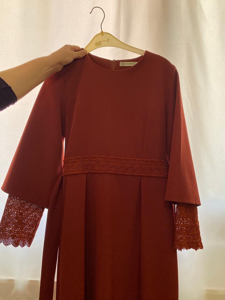 Bordo midi uzun kollu elbise, yuvarlak yaka ve dar kesim. Kollar ve bel kısmında dantel detaylarıyla klasik bohem tarzı sunar.