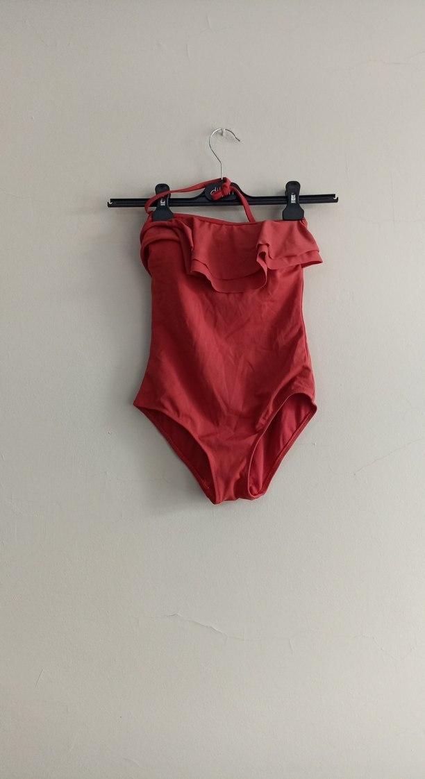 Kiremit renkli, mini boy ve fırfırlı detaylı, askılı kadın mayo. Minimalist ve bohem tarzıyla plajda kullanıma uygun.
