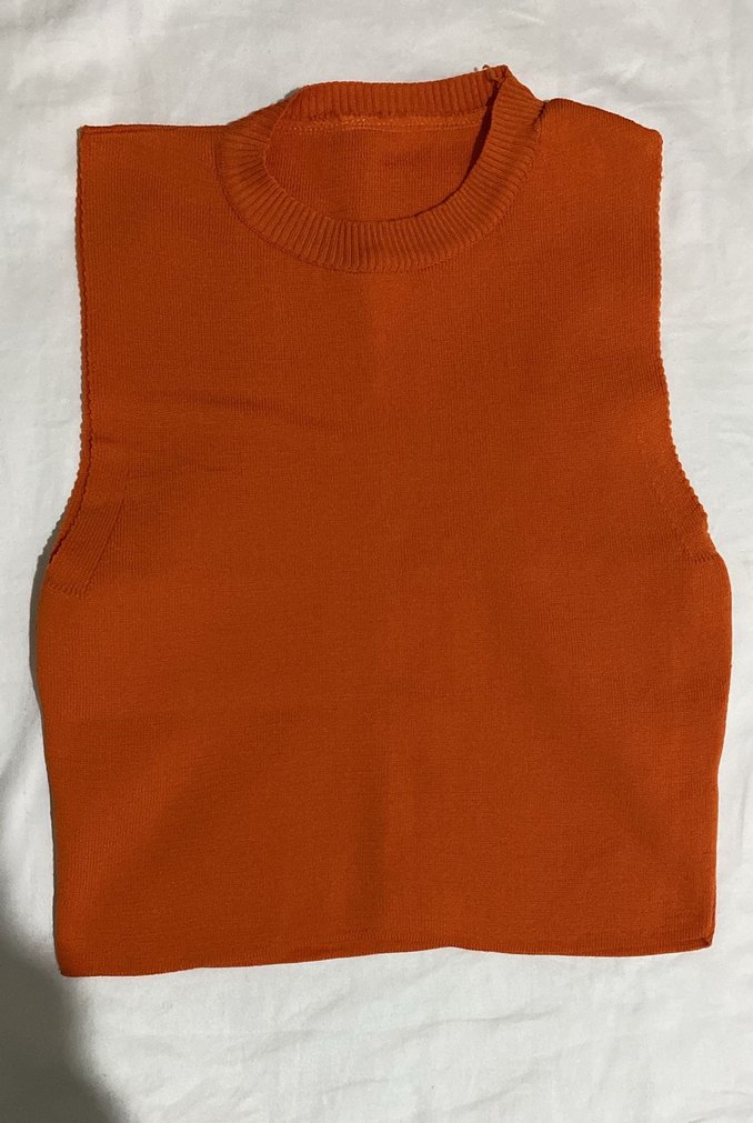 Dar kesim, kolsuz kadın süveter, yuvarlak yaka ve örme dokusuyla dikkat çeker. Yumuşak sentetik kumaştan, koyu kiremit renkte ve günlük kullanım için uygundur.