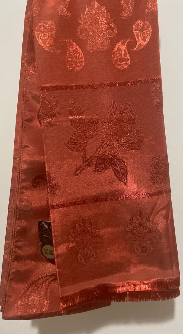 Vintage tarzda, kiremit parlak renkte, satenimsi dokuda, drapeli kadın şalı.